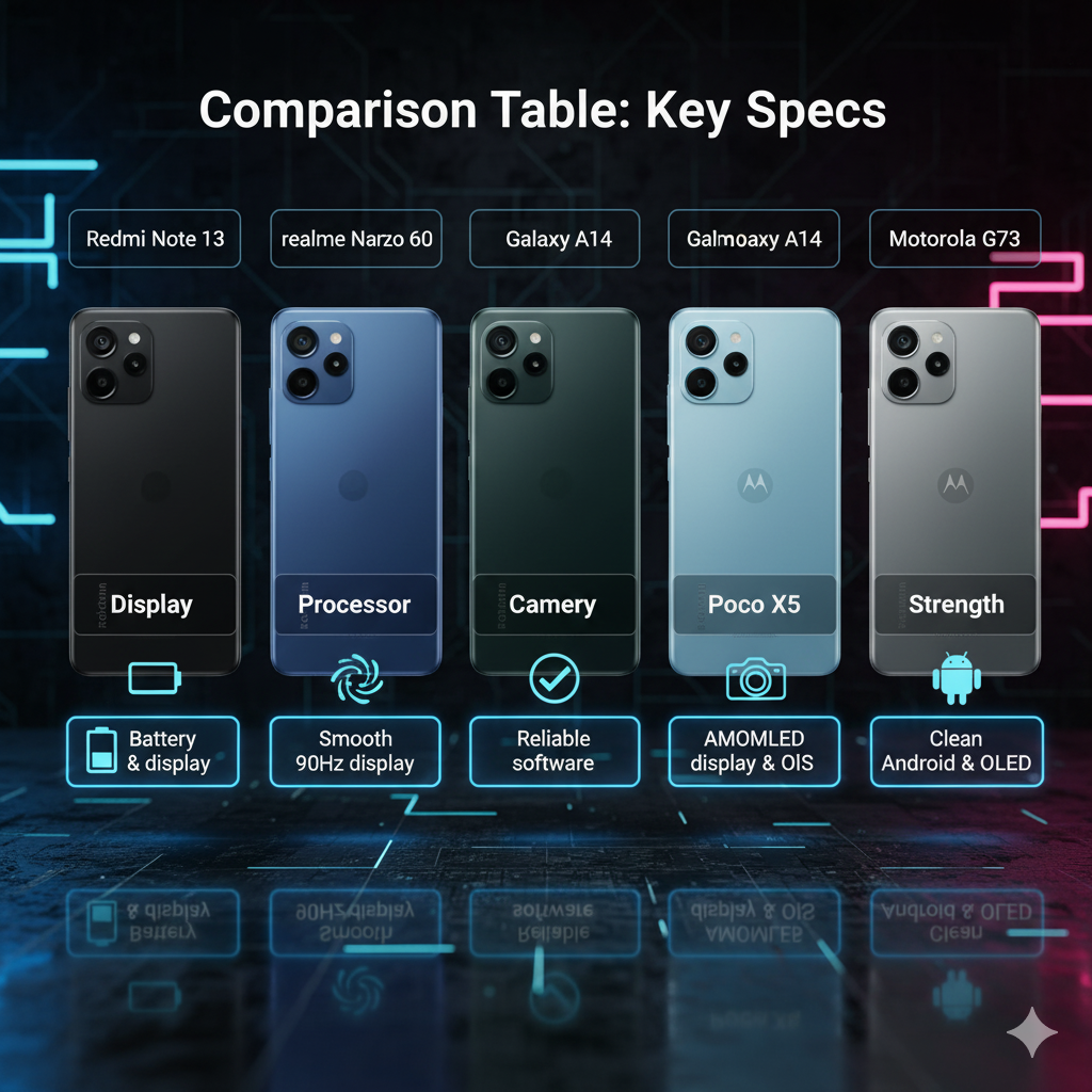 | Redmi Note 13 | 6.6″ AMOLED | Snapdragon 4 Gen 1 | 5000mAh | 50MP | Battery & display |