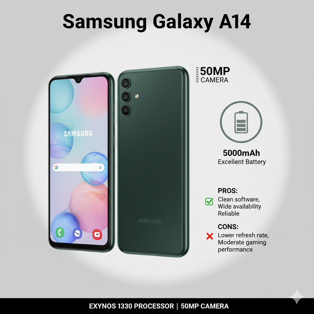 | Samsung Galaxy A14 | 6.6″ PLS LCD | Exynos 1330 | 5000mAh | 50MP | Reliable software |